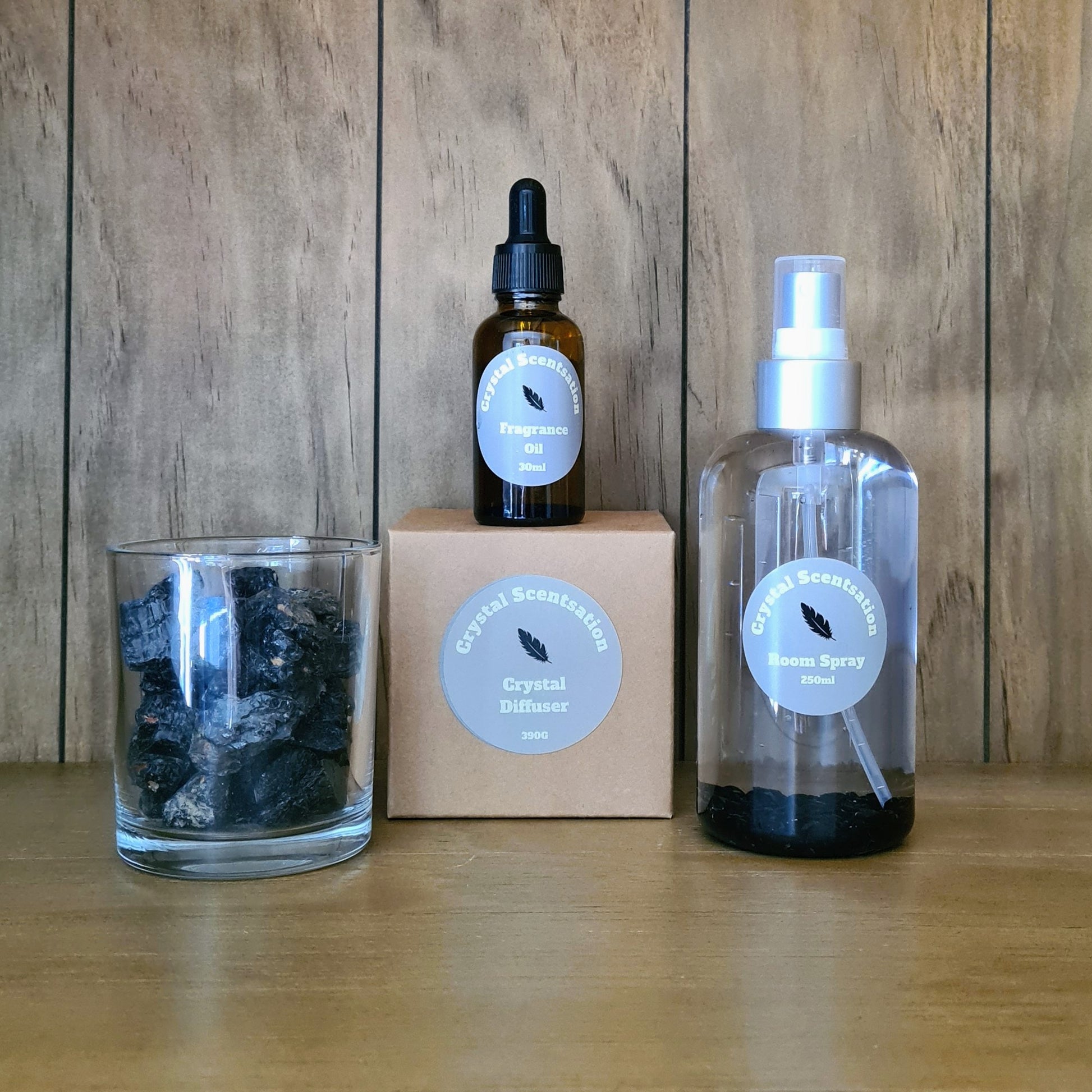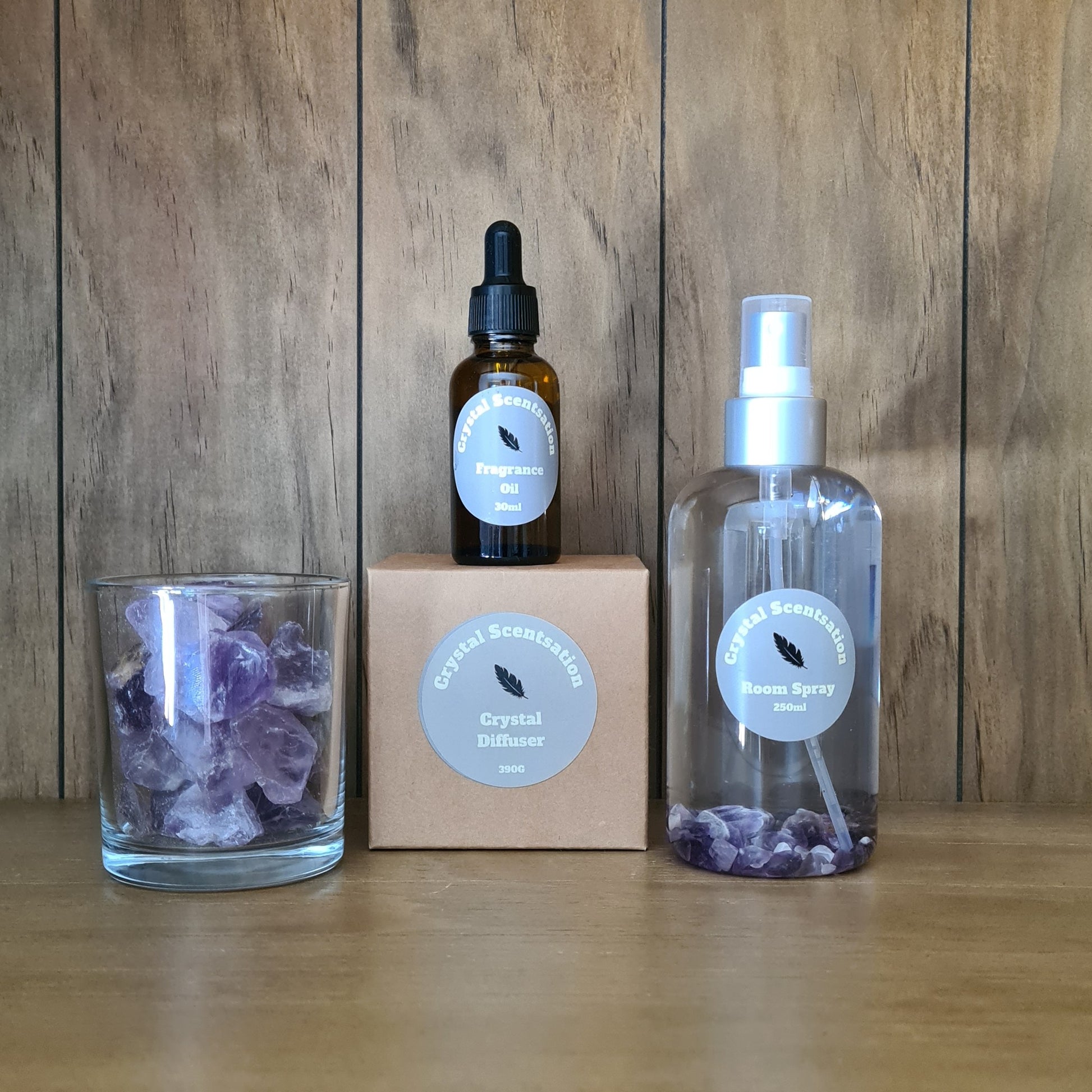 This bundle contains a 390g Crystal diffuser, 30ml Fragrance oil & 250ml Crystal Infused Room spray.